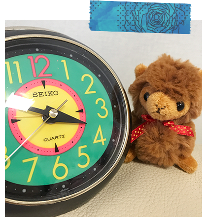 ぐりちゃん「この大きな時計はタイムスリップ映画のために用意したよ♪ 撮影の時はいっつもおにぎりを持ってきてるんだ〜、元気もりもりだよ★」