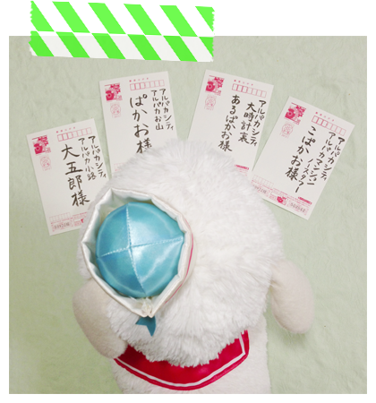 「アルパカシティでかくれんぼ」では、みなさんのアルパカ写真を募集しています。 ぬいぐるみでもポーチでもストラップでも、何でもオッケーです。もちろん本物のアルパカの写真や、アルパカのイラストでも構いません。 ・お名前(ハンドルネーム可) ・メールアドレス ・タイトル ・コメント(ブログURL等載せたい場合はこちらに) を記入の上、 pj.oc.oohay@obnerukak_edyticacapla までお送りください。※迷惑メール防止のため表示方向を反転しております。お手数ですが手入力お願いいたします。 お送りいただいた写真は、「アルパカシティでかくれんぼ」にて紹介させていただきます! ご注意: ・画像はご自身で撮影、制作されたものでお願いいたします。人物等プライバシーに関するものが写っている場合は、あらかじめ被写体等の了解を得た上でお送りください。 ・画像は長辺が500px以下になるサイズでお願いいたします。変更方法がわからない場合はこちらで対応しますので、その旨ご記入ください。 ・タイトル、コメント内に特殊な記号はなるべく使わないでください。 ・メールをいただいてから48時間以内に、受信確認のお返事をいたします。この返信メールが届かない場合は、記入もれもしくはメールサーバーの不具合等の可能性がございます。お手数ですが、再度お送りください。 |